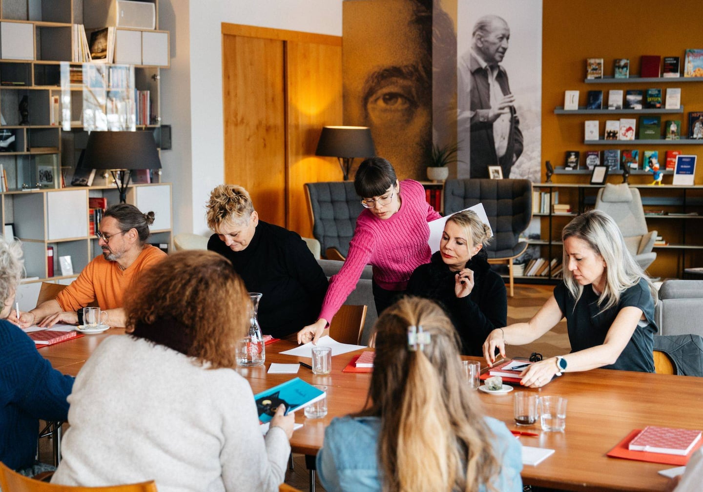 Den Auftakt bildete ein intensiver Workshop von Schriftstellerin und Dramatikerin Theodora Bauer. Im Mittelpunkt standen erzählerische Grundlagen: Wie entstehen glaubwürdige Figuren? Welche Perspektive trägt eine Geschichte? Und wie viel Beschreibung ist nötig, ohne zu überladen? Die Arbeit in Kleingruppen ermöglichte Theodora Bauer die persönliche Betreuung, wodurch in kurzer Zeit erste, bemerkenswert ausgereifte Textfragmente der Teilnehmerinnen und Teilnehmer entstanden.