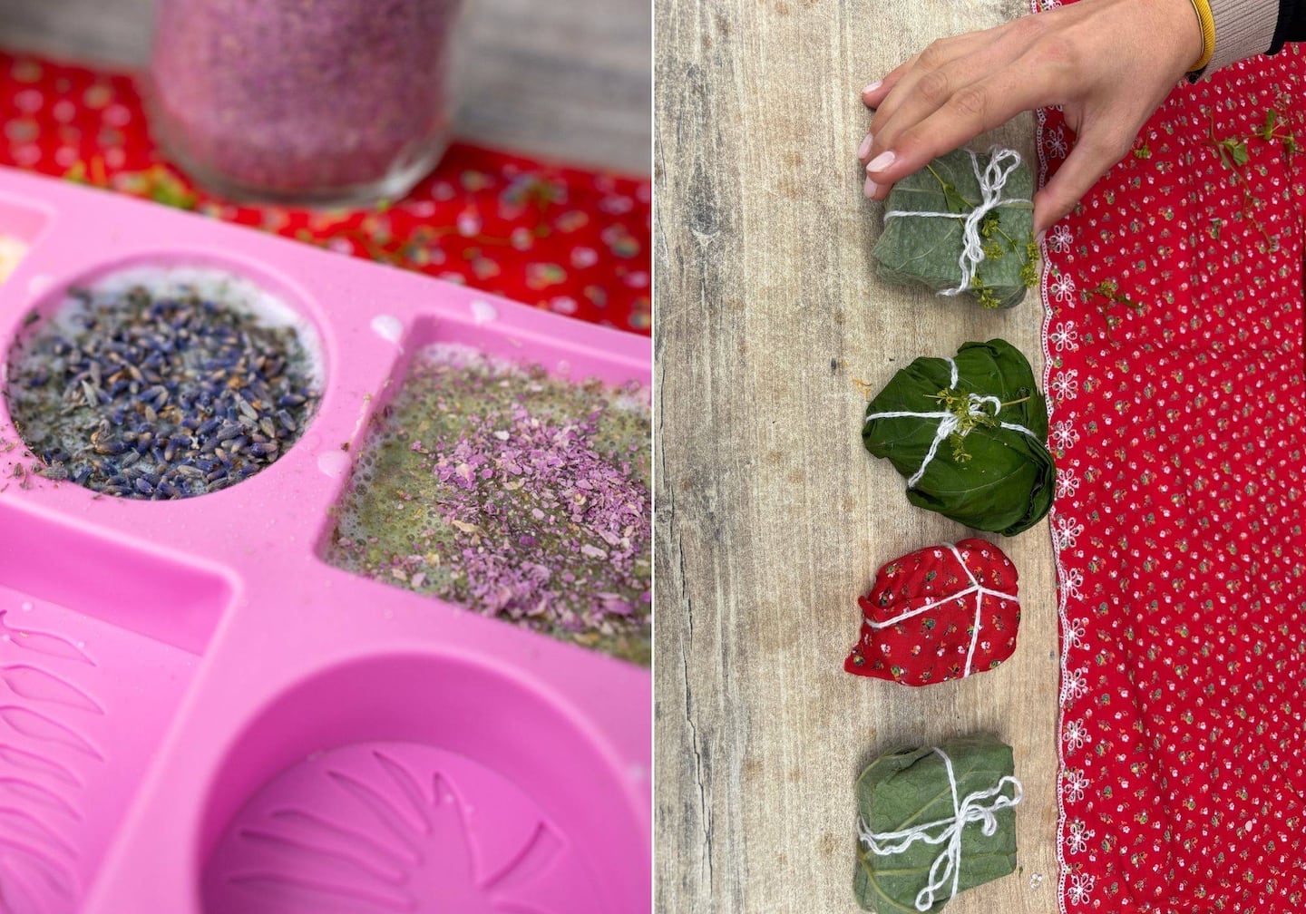 Gut erfrischt geht es dann zum Seifenworkshop mit Kräuterfrau Ingrid Ladner, einer wahren Frohnatur. Zunächst werden gemeinsam frische Blüten gepflückt und Wissenswertes über unsere wertvollen Pflanzen am Wegesrand gelernt. Wofür sind Frauenmantel und Spitzwegerich gut? Hier erfahren Sie es! Anschließend hat man die Möglichkeit, mit den gesammelten Schätzen, getrockneten Blüten und duftenden Ölen Seifenrohlinge individuell zu gestalten. Das Ergebnis darf natürlich mit nach Hause genommen werden.