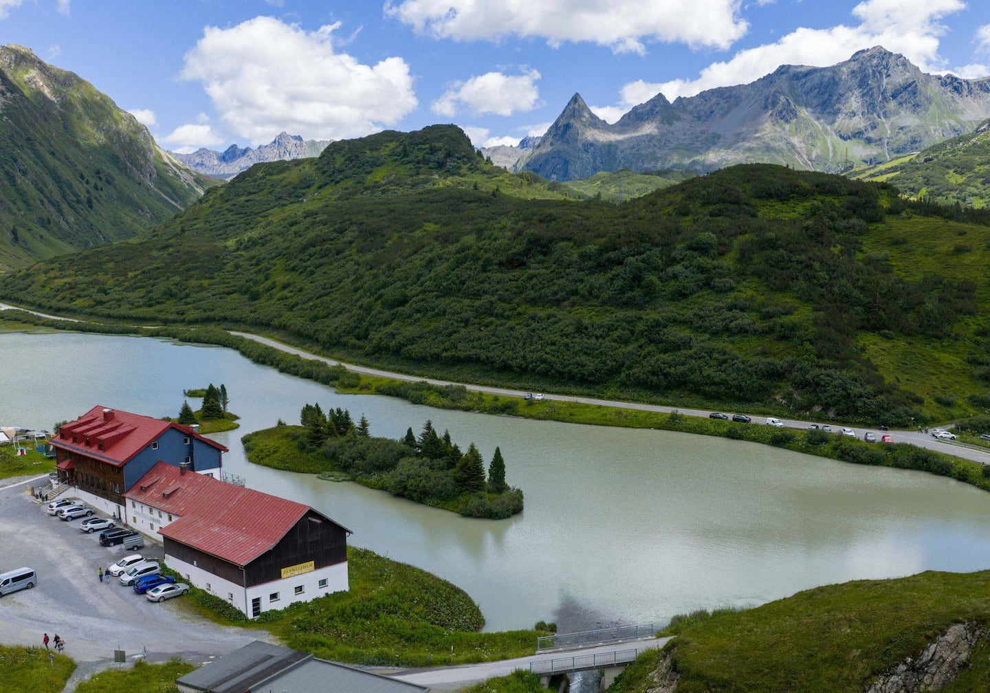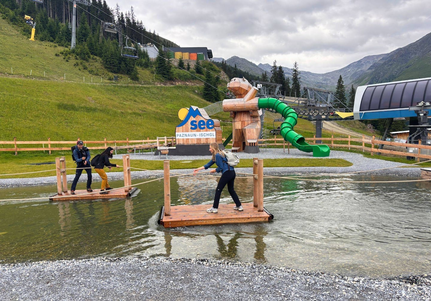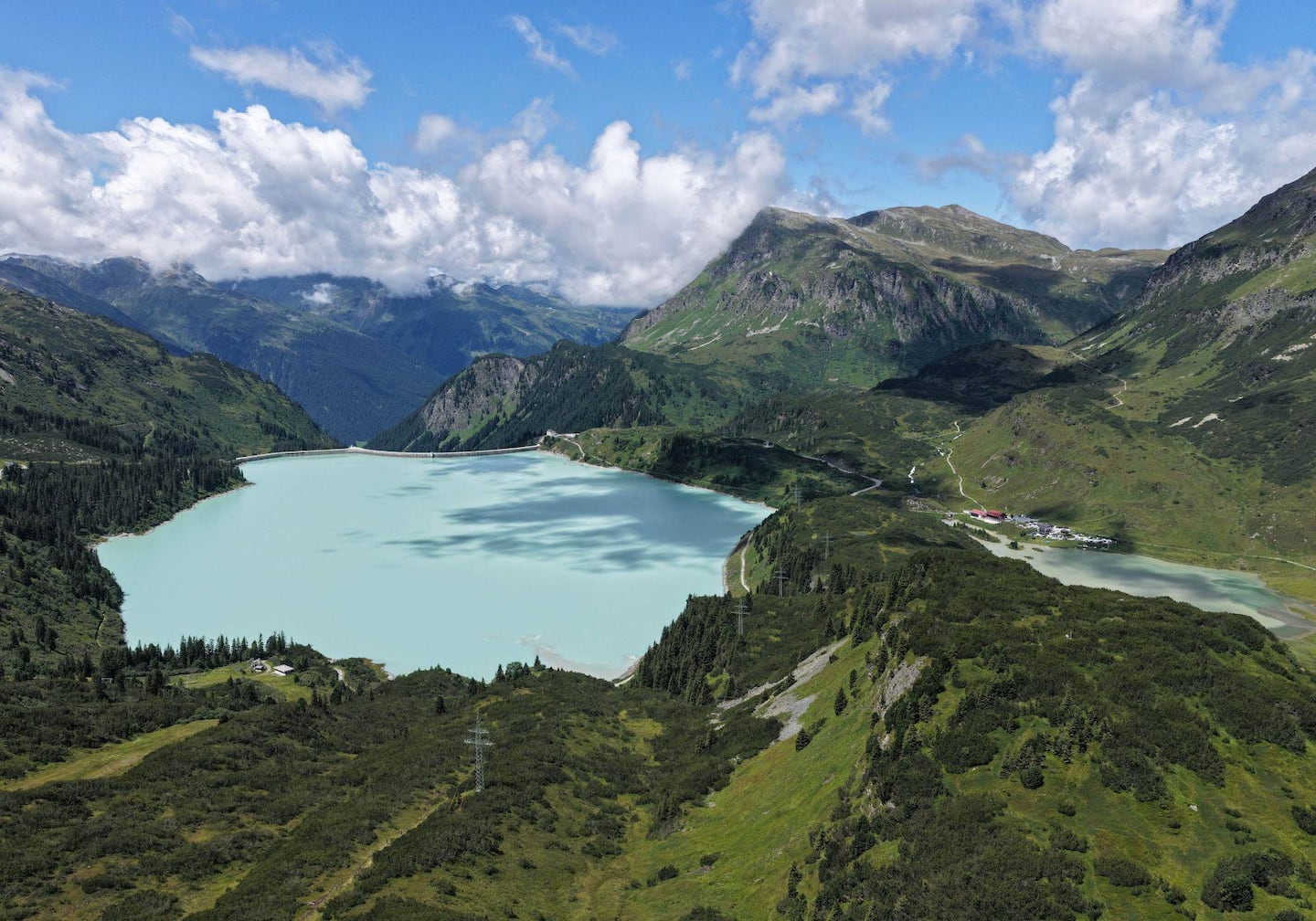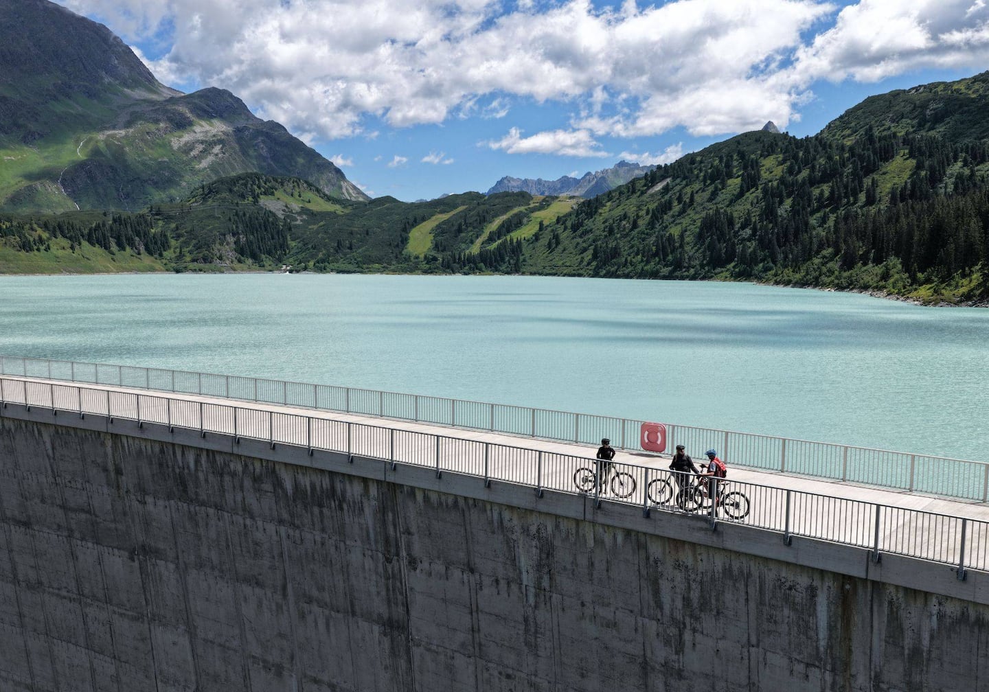 Danach geht es von Galtür aus mit der Alpkogelbahn hinauf in den Silvapark, wo direkt an der Ausstiegsstelle ein detailreich gestalteter Spielplatz auf kleine Abenteurer wartet. Von dort aus radeln wir weiter in Richtung Kops-Stausee. Dank der E-Bikes sind auch die steileren Passagen gut zu bewältigen. Der auf 1.800 Metern Höhe gelegene See beeindruckt mit seinem türkisblauen Wasser.