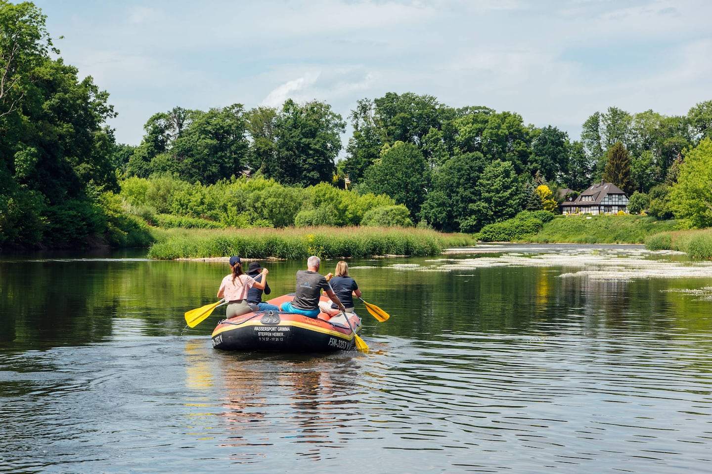 Schlauchbootfahrt auf der Mulde: Bei der Tour zwischen Leisnig und Grimma paddelt man unter sieben Brücken hindurch. Grüne Auenlandschaften, charmante Dörfer, barocke Schlösser und historische Mühlen bilden dabei einen schönen Blickfang.