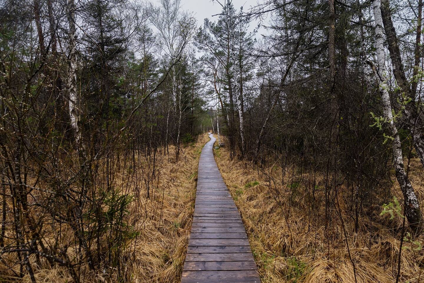 Entlang weitläufiger Felder und durch kleine Ortschaften erreicht man nach gut eineinhalb Stunden Fahrt mit dem Elektrofahrrad das Ibmer Moor. Wer kein eigenes Elektrofahrrad besitzt, kann sich eines in Braunau ausborgen. Maria Wimmer erwartet mich bereits – sie ist ausgebildete Natur- und Moorführerin und leitet durch den Moorlehrpfad. Das Besondere am Ibmer Moor ist, dass hier drei Moortypen aufeinandertreffen: Nieder-, Hoch- und Zwischenmoor. Das schafft eine Artenvielfalt an Vögeln und Pflanzen, wie man sie kaum woanders im Mitteleuropa findet: