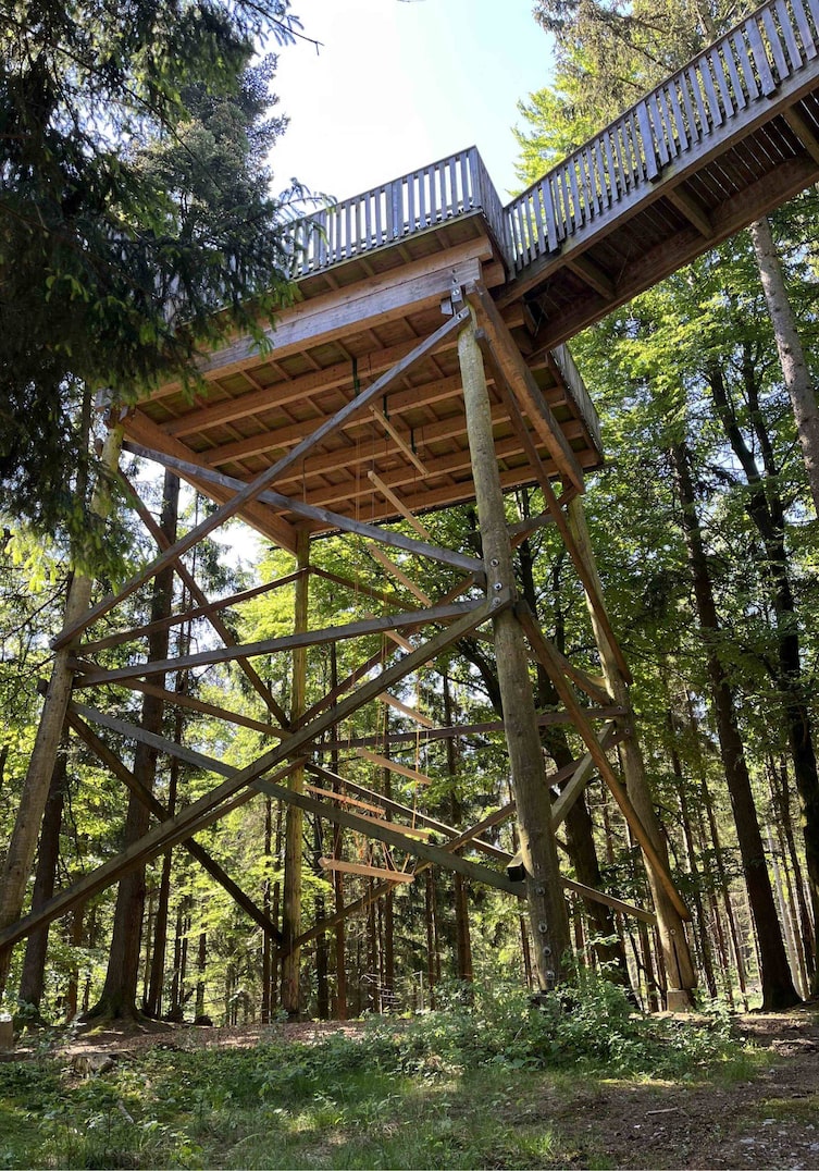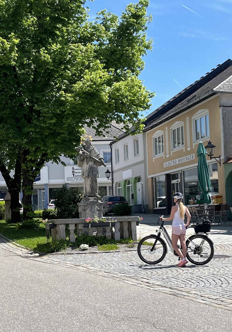 Bei strahlendem Sonnenschein werden wir samt unseren Rädern mit einem Shuttle vom lokalen Taxi-Service Eilmannsberger nach Kopfing befördert. Dort beginnt unser Tagesprogramm zu Fuß – und zwar im Naturerlebnispark Baumkronenweg. Mit seinem Baumhotel (bestehend aus 21 Baumhäusern), 5.000 m2 Waldspielplatz, Niederseilgarten und Riesentrampolin – ist es ein wahres Paradies für Familien und Schulausflügler. Aber auch ältere Naturliebhaber kommen auf einem 2 km langen Rundweg über den Baumwipfeln auf ihre Kosten. Den wortwörtlichen Höhepunkt stellt ein 40 m hoher Aussicht- und Erlebnisturm dar, der in seinem Inneren einen Escape Room für Abenteurer ab 16 Jahren birgt. Wir genießen die frische Waldluft und den atemberaubenden Blick über die Baumwipfel hinweg und schwingen uns nach einer kurzen Erfrischung im parkeigenen Gasthof Oachkatzl, das fast ausschließlich regionale Zutaten verarbeitet, auf unsere E-Bikes.