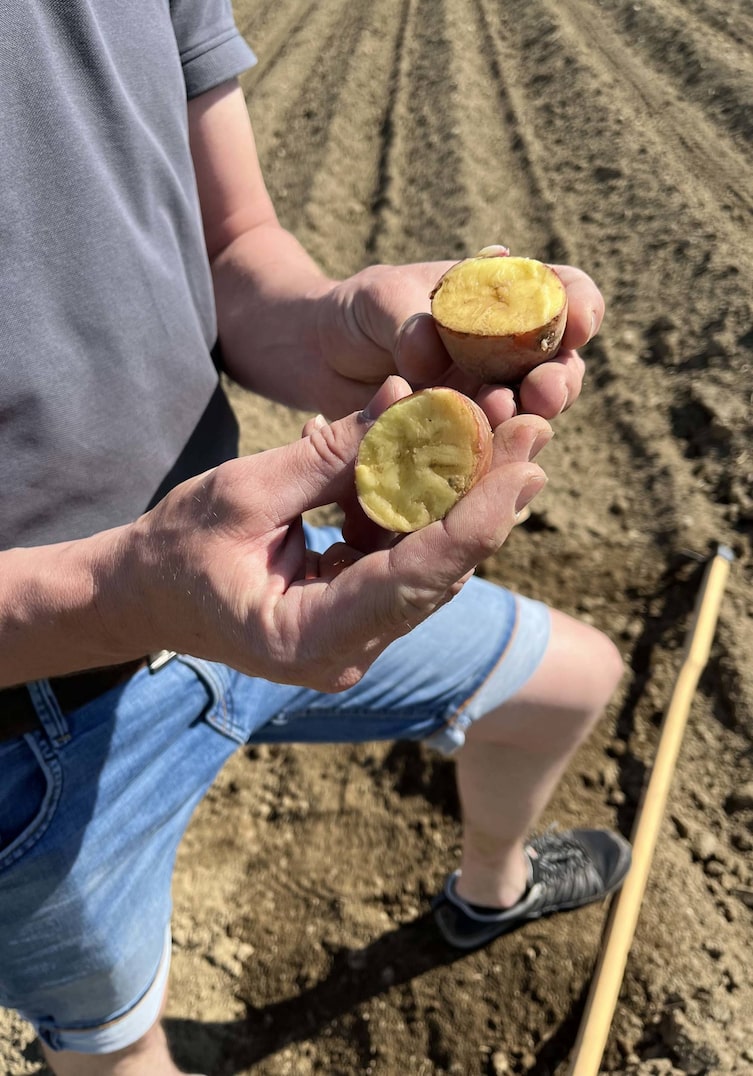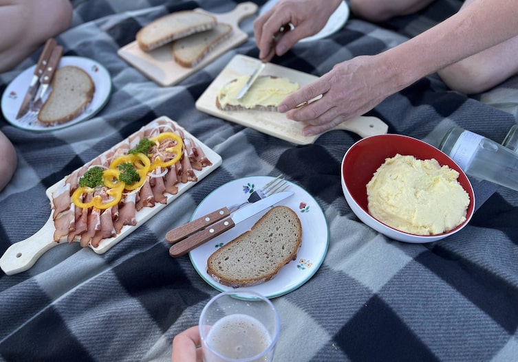 Bei Sauwald Erdäpfel treffen wir Geschäftsführer Martin Paminger, der etwas ganz Besonderes mit uns vorhat: Wir setzen Erdäpfel auf den hofeigenen Äckern. Dafür graben wir im Abstand von etwa 30 cm mit unseren Spaten kleine Löcher und legen die keimenden Setzlinge hinein, decken sie mit Erde zu. Dann beginnt das Warten. In wenigen Wochen werden die von uns eingepflanzten Kartoffeln österreichweit in Supermärkten zu kaufen sein. Nach kurzer Wanderung mit Blick auf das auf der anderen Seite des Donautals gelegene Schloss Rannariedl lassen wir uns bei einem Genuss-Picknick am nahegelegenen Löschsee von Martin über die Besonderheiten der steinigen Äcker in der Region aufklären und lernen mehr über die Geschichte des Erdäpfelanbaus. Dazu serviert es uns seine Leibspeise: hausgemachten Erdäpfelkas mit Speck und Apfelcider.