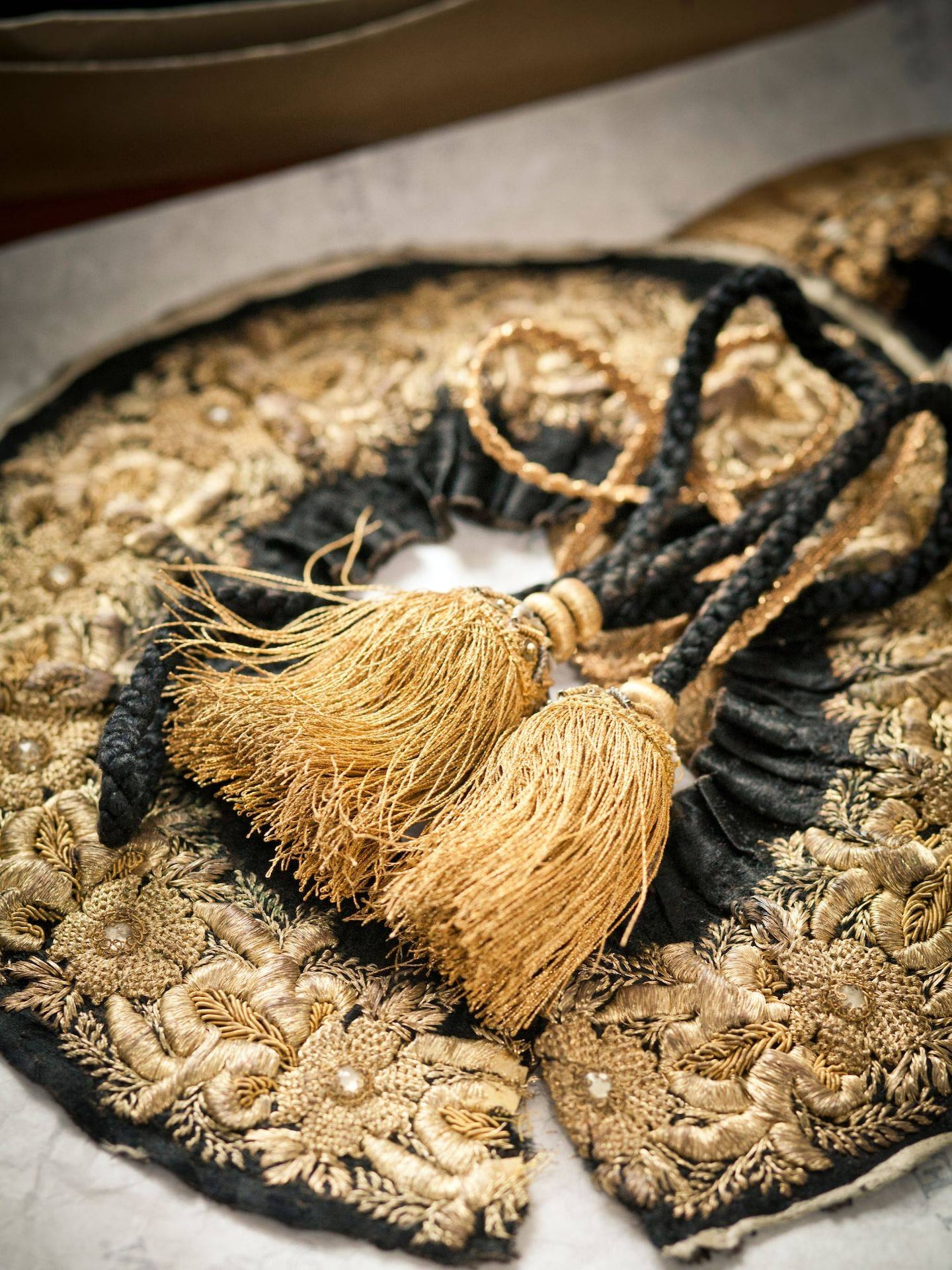 „Früher war ein solcher Hut wirklich etwas ganz Besonderes“, sagt Monika Voggenauer, „und an der Stickerei hat man erkannt, wie wohlhabend seine Trägerin war.“ Je aufwendiger die Arbeit, desto höher der Preis. Auch an den einseitig oder beidseitig applizierten Quasten ließ sich der Wert erahnen. Charakteristisch ist zudem das „Hint-obi-Bandl“ aus Samt. Es darf auf keinen Fall länger sein als der Rock.