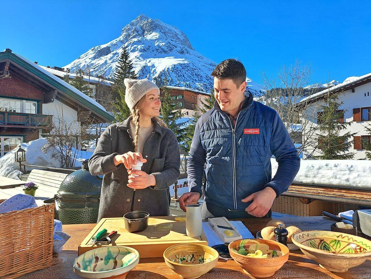 In Lech am Arlberg besucht Paula Bründl ihren ehemaligen „Steirereck“-Kollegen Jakob Strolz, im familieneigenen Hotel „Schmelzhof“. Jakob Strolz ist jetzt der junge Küchenchef im Restaurant der Eltern, genauer gesagt in „Gittis Esszimmer“. Nach Stationen bei Sepp Schellhorn, Thorsten Probost, Alain Ducasse oder Heinz Reitbauer kocht er in der Wintersaison daheim. Paula Bründl erinnert sich mit einem Schmunzeln an die Lehrzeit bei Jakob: „Es war bei uns Liebe auf den zweiten Blick Ich hab‘ ihm immer fleißig zugarbeiten können, manchmal habe ich von ihm ein bisschen eine über den Deckel gekriegt, aber dafür hat er mir sehr, sehr viel beigebracht.“