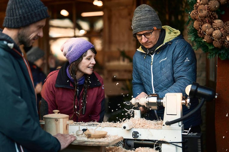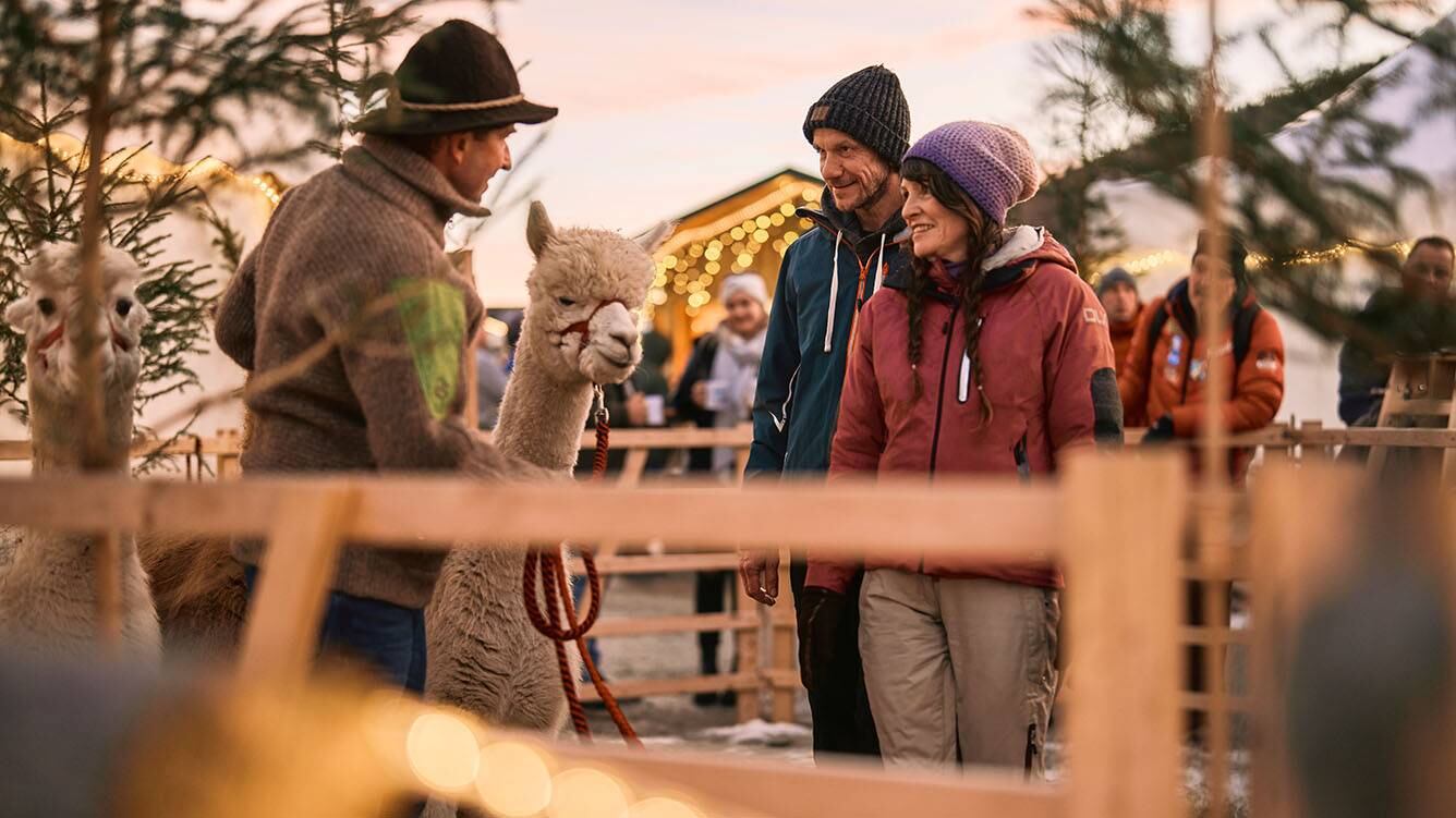 Alpakas und echte Handwerkskunst erwartet Besucher auf dem Christkindlmarkt im Naturpark Almenland. Nahe dem See gelegen, verwandelt sich der Innenhof der Latschenhütte in der Adventszeit in ein farbenfrohes Weihnachtswunderland und lädt zur Stärkung und zum Verweilen ein. Schmiede und Drechsler geben bei Vorführungen Einblicke in ihre traditionellen Handwerke und bringen kleine und große Augen zum Leuchten. Auch die Kulinarik steht auf der Latschenhütte ganz im Zeichen der Drechselkunst: So ist der Adventmarkt für seine mit Bohrer und Schleifmaschine geformten – und anschließend frittierten – Erdäpfelspiralen bekannt. Nur wenige Meter weiter erfreuen sich derweil die Alpakas von Züchter Robert Stelzer über die Streicheleinheiten der Besucher. „Den Erwachsenen taugen die Alpakas genauso wie den Kindern“, sagt Stelzer aus dem nahegelegenen Gasen augenzwinkernd. Abgerundet wird der Besuch durch die stimmungsvollen Weihnachtsmelodien der Bläsergruppen.