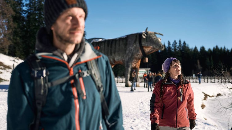 Sanfte Winter erlebt man im oststeirischen Almenland auf 1.200 Meter Seehöhe. Rund 50 Kilometer von der Landeshauptstadt Graz entfernt, lädt die Region zum Entspannen und Durchatmen ein. Einen zentralen Treffpunkt in der idyllischen Winterszenerie stellt dabei der Teichalmsee dar. Entlang des Gewässers begrüßt ein präparierter Winterwanderweg Besucher und führt diese direkt am Wahrzeichen der Region vorbei: einem überdimensionalen Holzochsen. Die Figur symbolisiert die jahrhundertealte Almrind-Haltung der Region und wurde mit über 20.000 Schindeln handgedeckt. Die wichtigsten Informationen zum Rundwanderweg mit dem Holzochsen haben wir hier zusammengefasst.