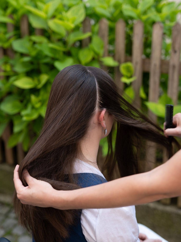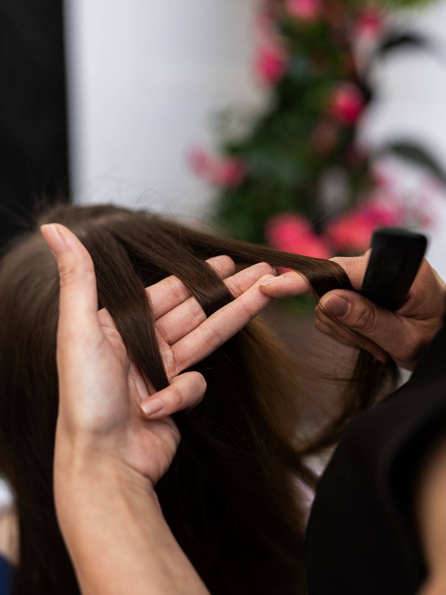 Nicole Shaqiri von Sturmayr Coiffeur in Salzburg beginnt mit einer Haarabteilung auf Höhe des Ohrs. Die Haare im Nacken werden glatt nach hinten gebürstet und entlang des Ohrs in drei gleichmäßige Stränge geteilt.