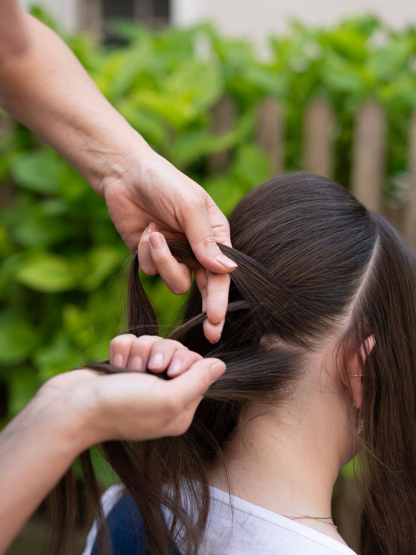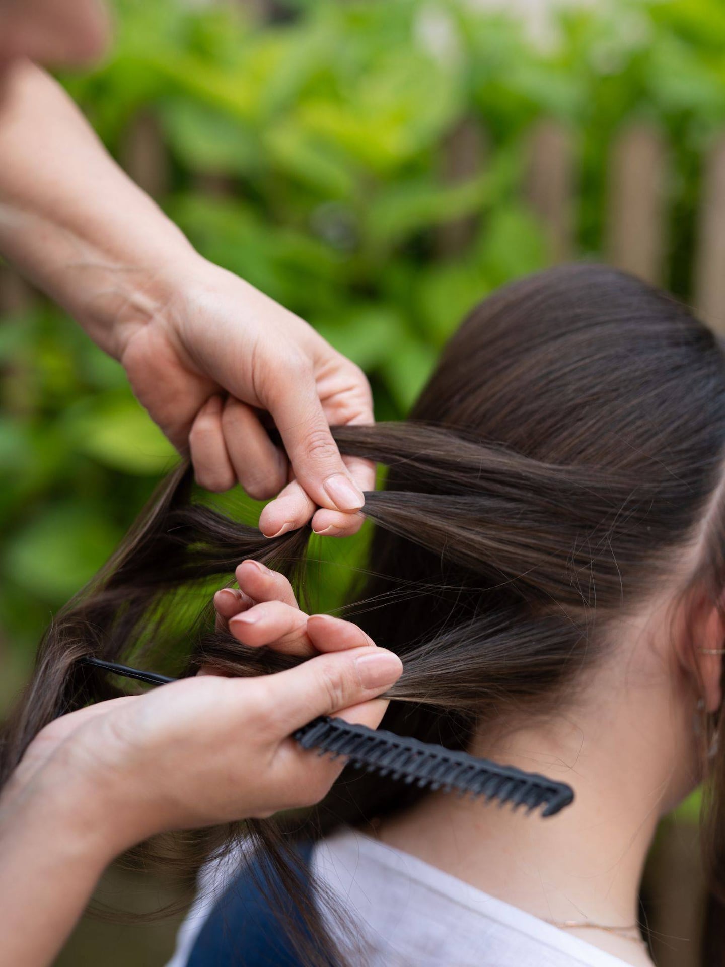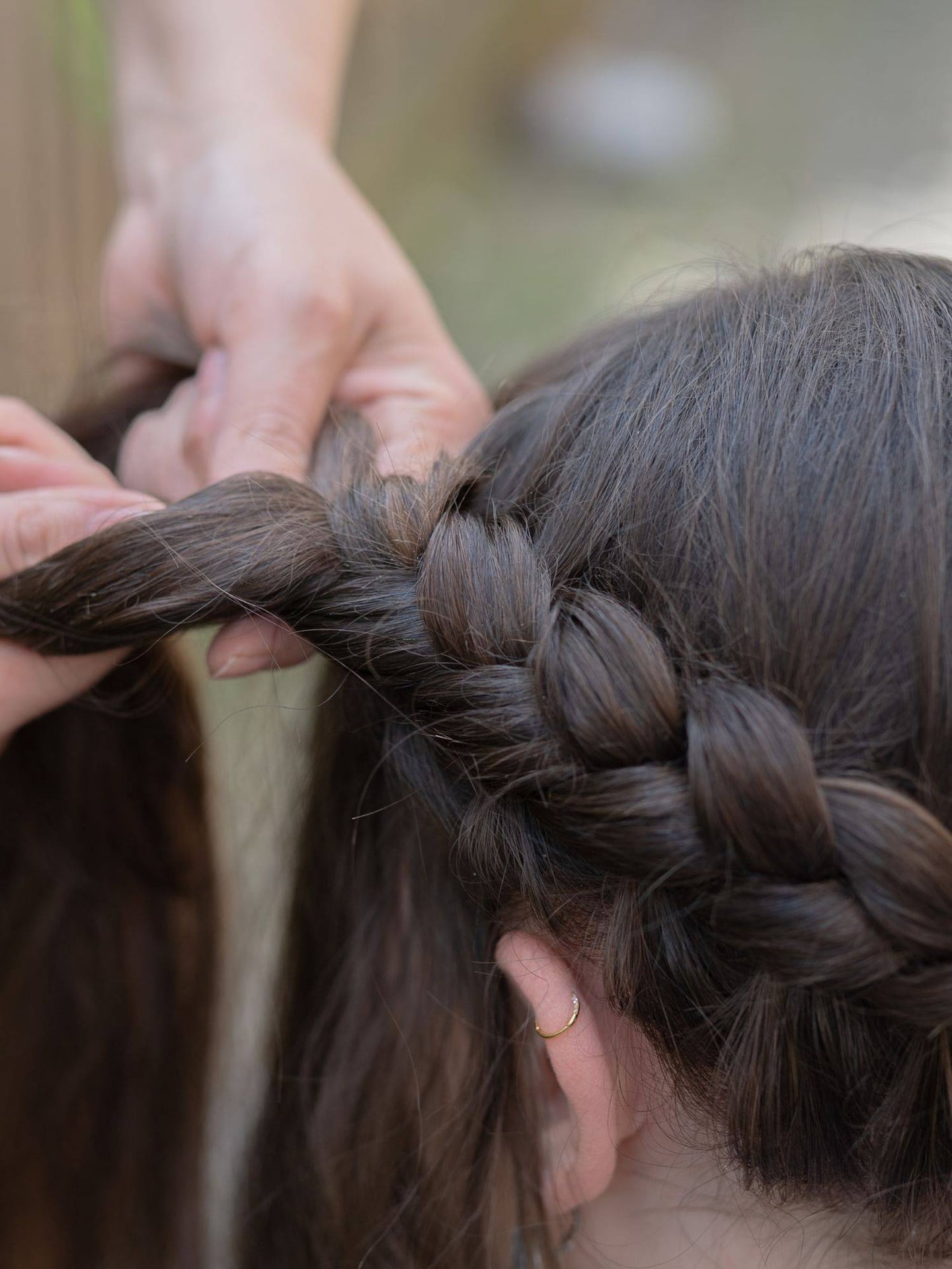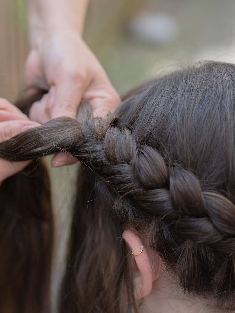 Dann geht es ans Flechten: Es wird dabei immer ein Strang von außen über den mittleren Strang gelegt. Dabei wird abwechselnd von rechts und links ein Strang über den mittleren gelegt. Bei jedem Schritt kommen von oben und unten neue Haarpartien dazu – so entsteht ein dichter, eng anliegender Zopf, der sich einmal um den ganzen Kopf zieht. Wichtig dabei: gut festziehen. Das gibt der Frisur Halt und lässt die Flechtstruktur schöner zur Geltung kommen.