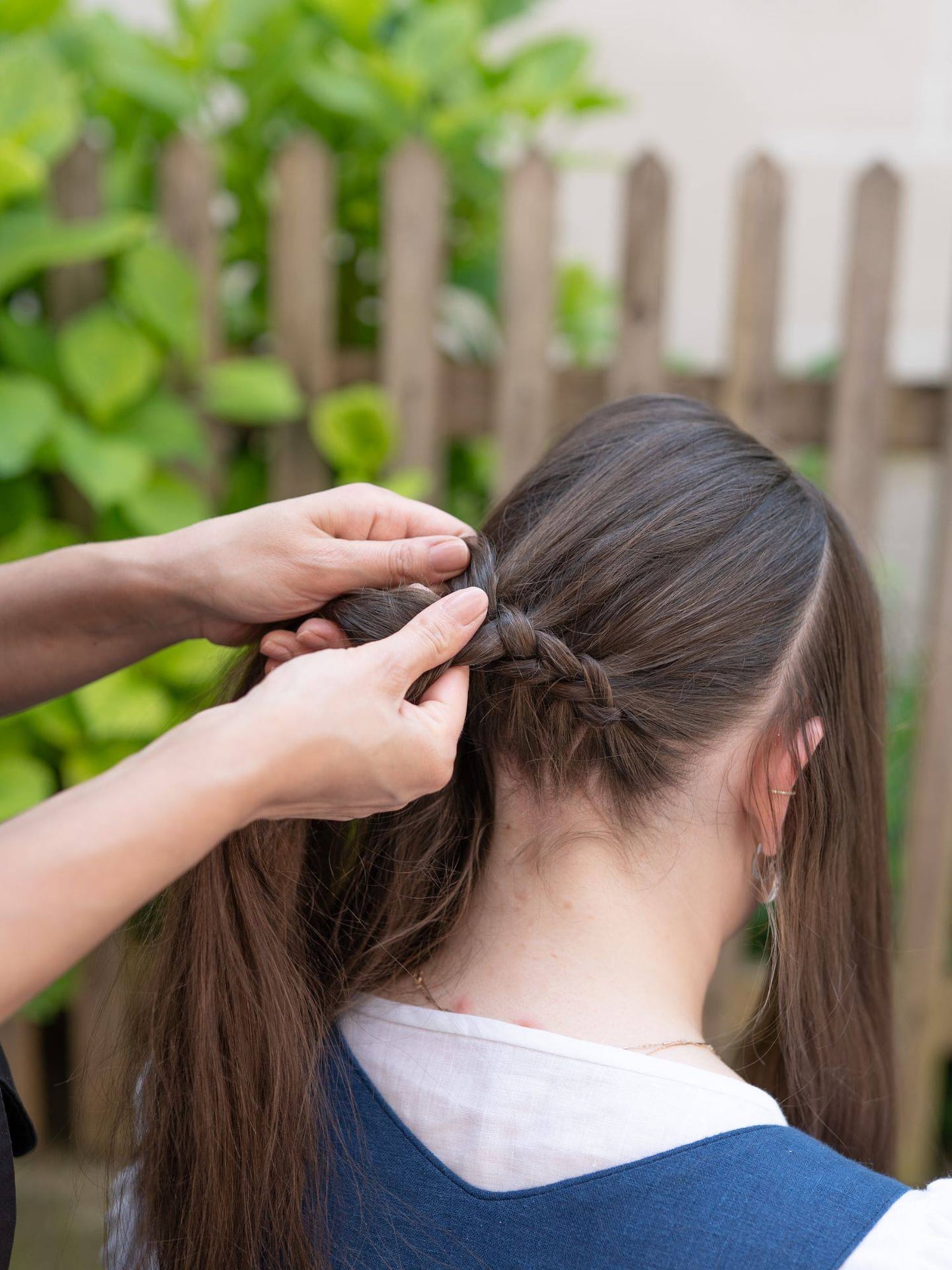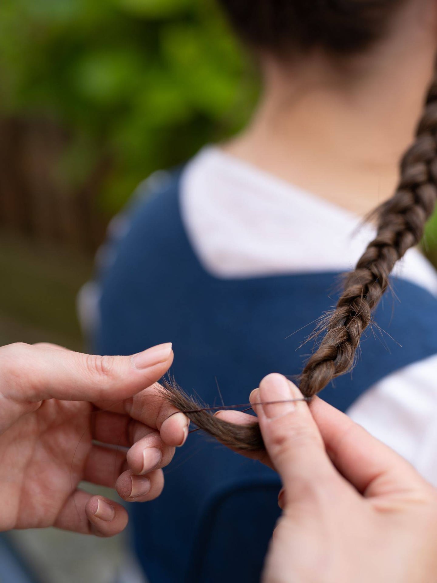 Sind alle Haare eingeflochten, wird der Zopf bis zu den Spitzen weitergeführt und mit einem schlichten Haargummi fixiert.