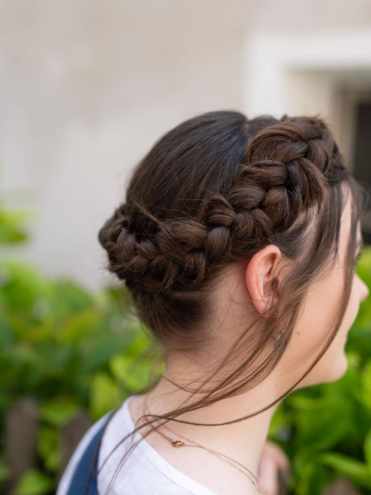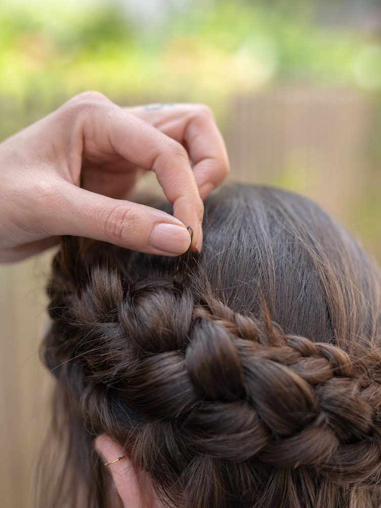 Wenn der Zopf den ganzen Kopf umrundet hat, wird er gerade bis zu den Spitzen fertig geflochten, dann vorsichtig unter den Kranz gesteckt und mit Haarnadeln fixiert.
