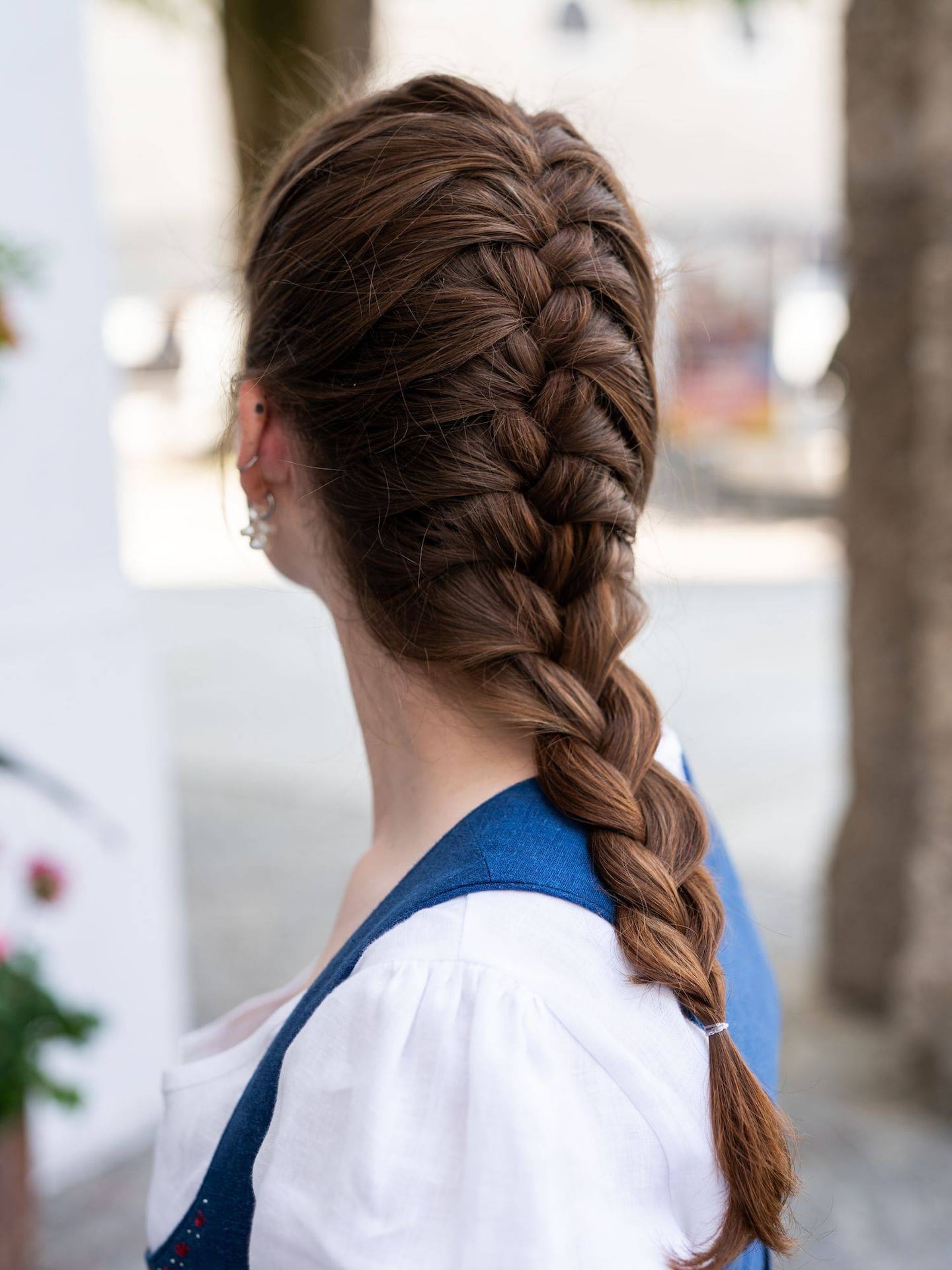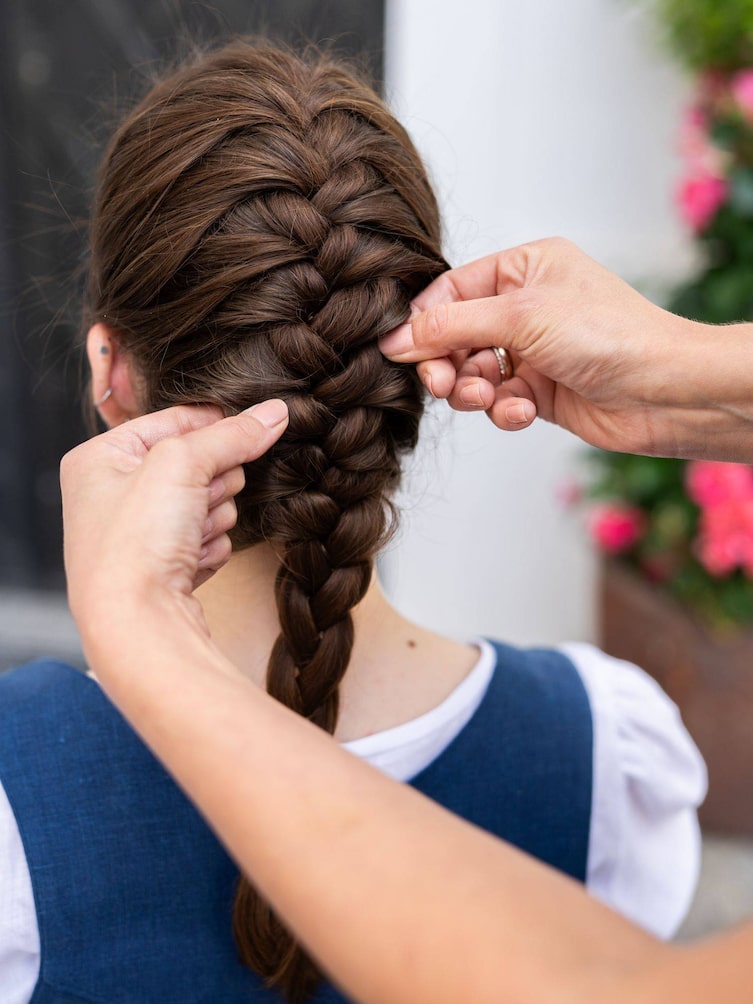 Kein Grund zur Verwirrung: Der Bauernzopf wird häufig auch Französischer Zopf genannt. Früher wurde er eher zu festlichen Anlässen getragen, heute ist er aber auch im Alltag gerne gesehen. Zum Dirndl macht er allerdings unabhängig vom Anlass eine gute Figur und lässt sich verspielt mit Blüten im Haar oder auch einem Hut tragen.