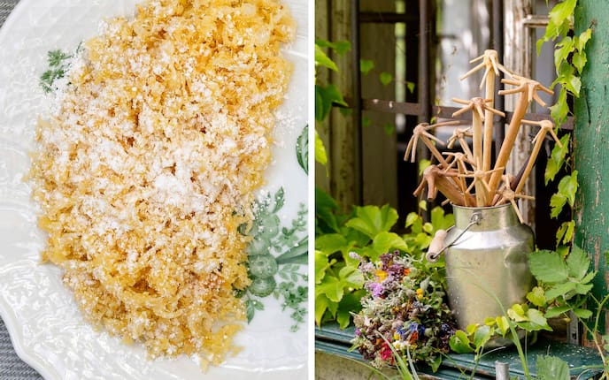 Es ist die Vielfalt, die den Erdapfelacker der Mosers auszeichnet: Jede Erdreihe birgt eine andere Rarität. Mit „Violetta“, „Andengold“ und der „Lungauer Blauen“ machen Andrea Moser und Paula Bründl ein Gratin, das nicht nur in seinen Farben, sondern auch im Geschmack vielfältig ist. Und die ein einfaches Gericht zu einem Blickfang machen. Wie die Mosers zu der außergewöhnlichen Sortenvielfalt an Eachtlingen gekommen sind, hören Sie im Servus Küche Podcast – oder lesen Sie in der September-Ausgabe des Servus-Magazins.