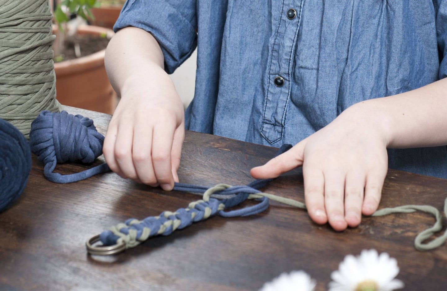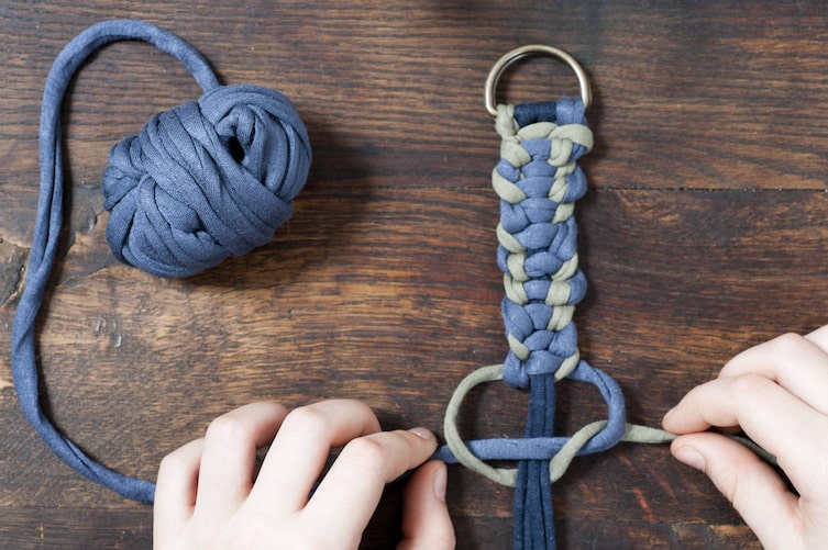 Praktisch: Das verwendete Baumwollgarn kann selbst hergestellt werden. Dazu werden alte T-Shirts je nach gewünschter Dicke des Garns zu breiten, möglichst langen Bändern zerschnitten. Werden diese in die Länge gedehnt, rollt sich der Stoff ein und kann zu einem Garnknäuel aufgewickelt werden.