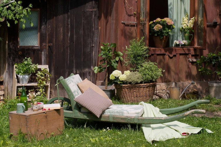 Eine alte Schubkarre wird zum gemütlichen Liegestuhl