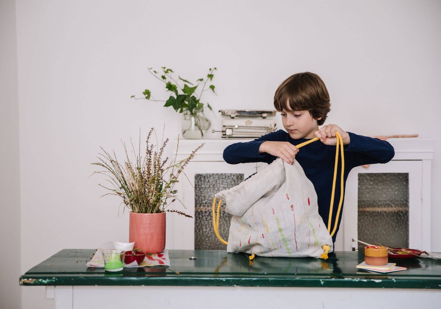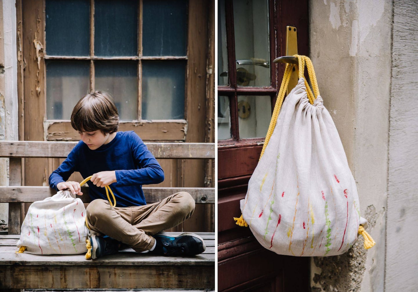 Ein Sackerl für alle Fälle. Nadel und Faden, Leinen, Ösen, Kordel und etwas Geschick: Viel braucht es nicht, um ein Turnsackerl selber zu basteln. Mit Stofffarben und Gräsern als Druckmodel bekommt der Beutel auch noch ein hübsches Muster.