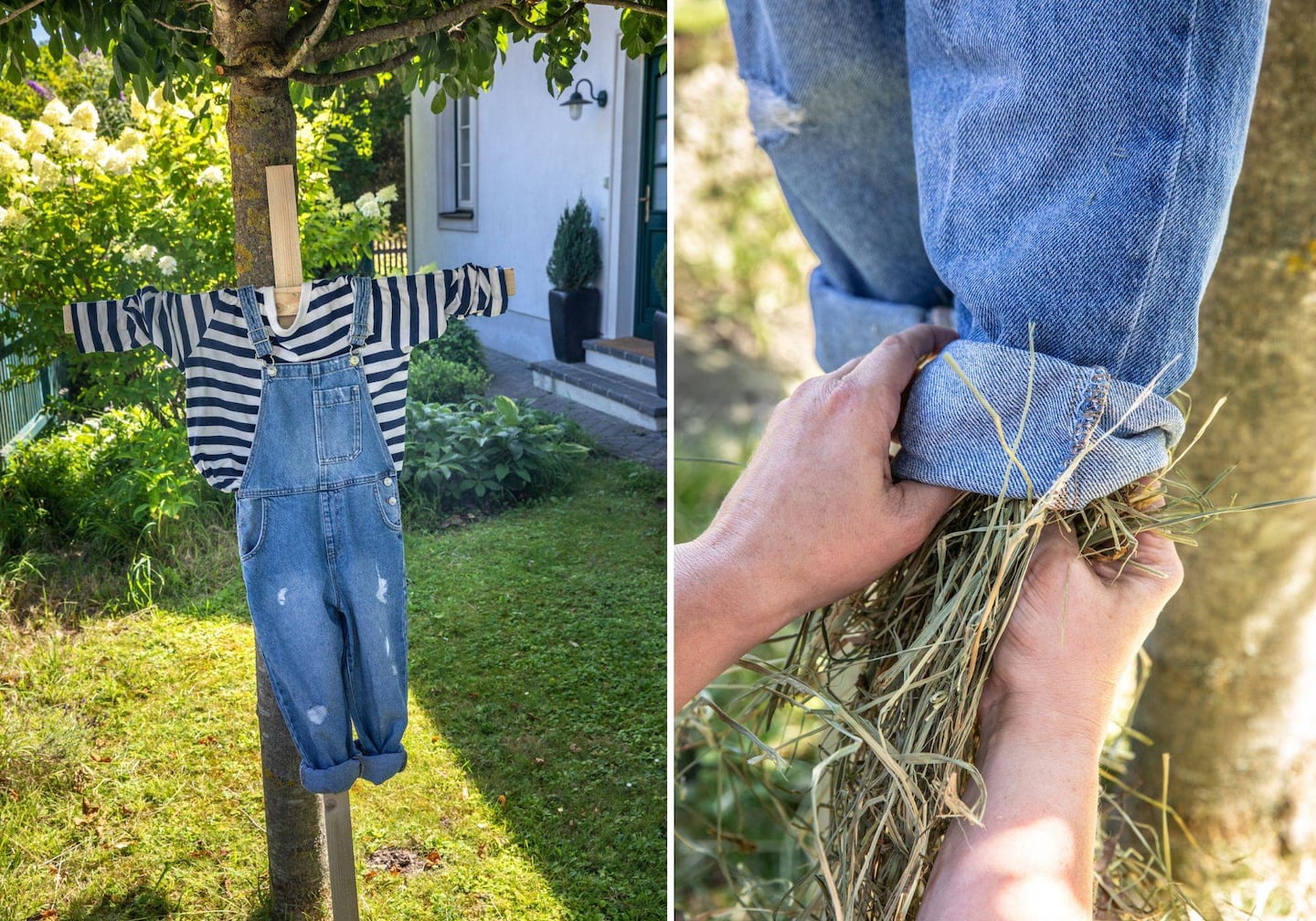 Den Körper und einen kleinen Jutesack mit Stroh ausstopfen und diesen als Kopf auf dem Steher platzieren.