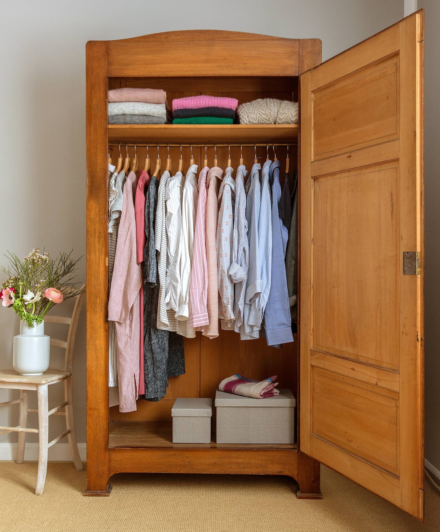 Von lang auf kurz, von dunkel auf hell und – wenn es die Garderobe hergibt – in einer Farbwelt bleibend: Das ergibt Struktur und Übersicht im Kleiderschrank. Werden die einzelnen Kleidungsstücke zusätzlich an Bügel der gleichen Art gehängt, wirkt alles noch einmal ordentlicher.