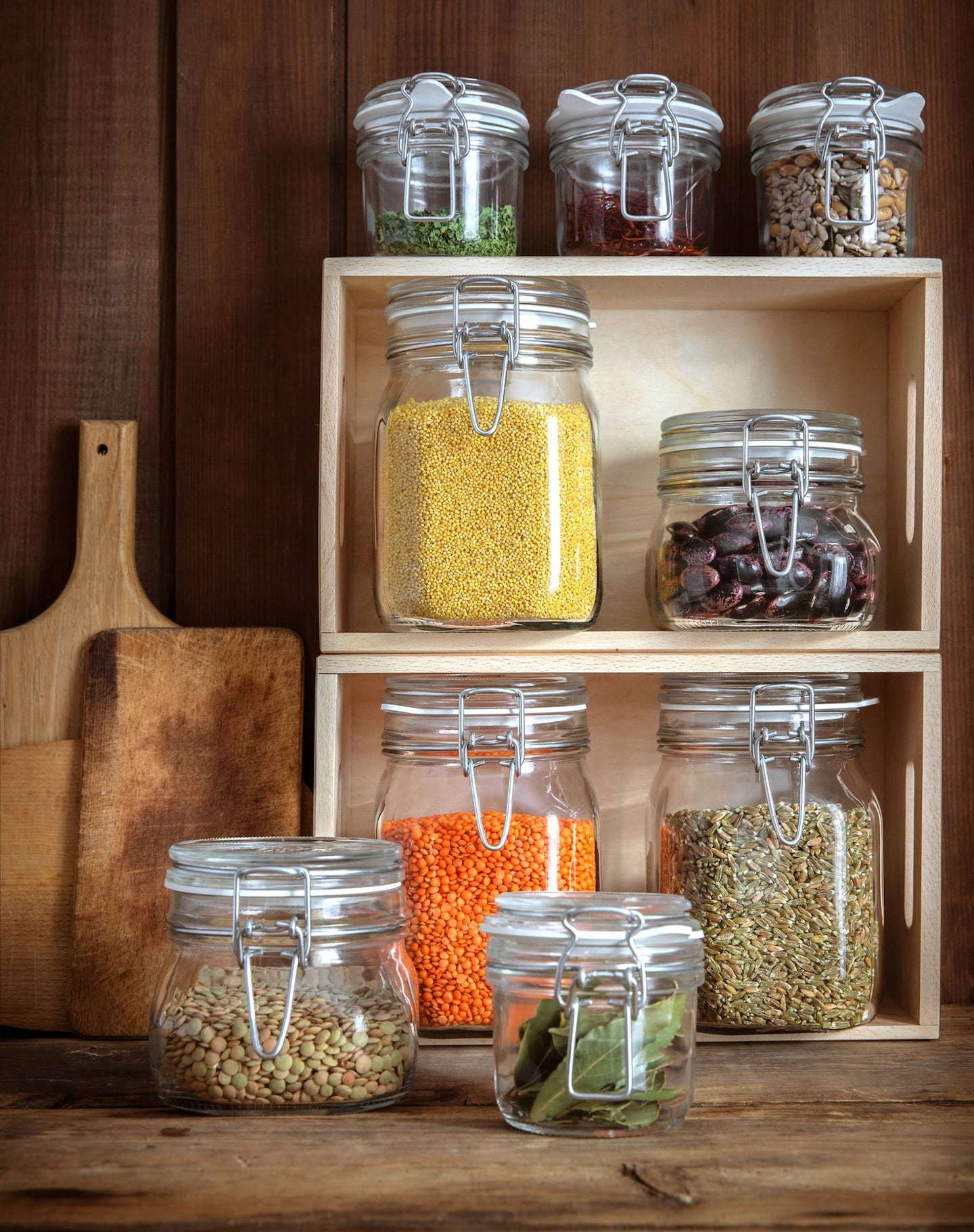 Lebensmittel wie Bohnen, Linsen, Gewürze, Zucker und Mehl kommen in den unterschiedlichsten Behältnissen ins Haus und sorgen leicht für Chaos im Küchenschrank.
