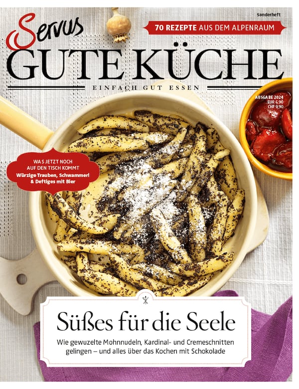 Küchenkalender 2025: Jänner bis Juni Rezept Bärlauch-Palatschinken mit Räucherforelle In der Palatschinke versteckt sich würziger Räucherfisch. Der Bärlauch, außen an den Teig gebacken, macht einen echten Blickfang aus dem Gericht. Rezept Schnittlauchkrapfen Schnittlauch schwimmt nicht nur auf jeder guten Suppe und macht aus einem Butterbrot eine Delikatesse. Er kann auch zur Füllung werden. Rezept Spargel-Topfenkuchen Knuspriger Blätterteig, eine cremige Topfenschicht und darauf zarter grüner Spargel – Schicht für Schicht ein Genuss. Seminarbäuerin Nicole Leitner und ServusTV-Moderatorin Conny Bürgler zeigen uns im Video, wie's geht. Rezept Fisolenfleisch Im gschmackigen Schweinegulasch werden die Fisolen gleich mitgegart. Dazu passt eine knusprige Kaisersemmel. Vorspeise Wintersuppe mit Knollenziest und Nudeln Hauptspeise Kochsalat mit Linsen und Würsteln Juli bis Dezember Rezept Käferbohnen-Frühstück mit Spiegelei Wer es zum Frühstück gerne deftig mag, ist hier genau richtig. Die Käferbohnen werden in einer Paradeisersauce mit angeröstetem Speck und köstlichen Zwiebeln serviert. Rezept Gebackene Rote Rüben mit Krensauce Eingelegt oder zur Suppe zubereitet kennt sie jeder. Aber haben Sie schon einmal gebackene Rote Rüben probiert? Rezept Pastinaken-Wurzelbrot Knusprig und frisch kommt das Pastinaken-Wurzelbrot aus dem Ofen und schmeckt am besten mit einem reifen Stück Käse. Rezept Rotes Spitzkraut aus dem Ofen Das rote Spitzkraut eine gern gesehen Beilage zum Schweinsbraten kommt bei uns heute aus dem Ofen. Kräftig gewürzt und mit salzigem Schafkäse überbacken, kommt es aber auch fleischlos ganz gut an. Hauptspeise Artischockensalat mit gebratenem Zander Hauptspeise Kugelzucchini, mit Zwiebelreis gefüllt Servus in Stadt & Land Jänner 2025 Servus Kinder Servus Gute Küche 2024 Servus Unser Garten 2024