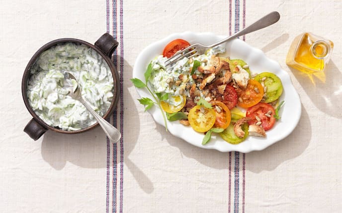 Salat Gurkensalat mit Joghurt und Knoblauch Dieser Gurkensalat ist als mediterrane Vorspeise ebenso gut zu genießen, wie als erfrischend-würzige Beilage zu feinem Grillgut. Dazu gibt es frische Tomaten mit knusprigem Brot.