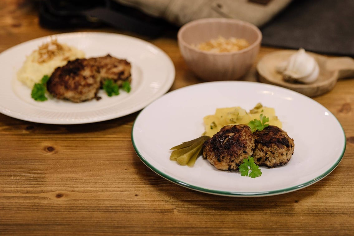 Die Kartoffeln als Pellkartoffeln (also in der Schale) kochen, schälen und abkühlen lassen. Tipp von Familie Freund: Am besten schon am Vorabend kochen.