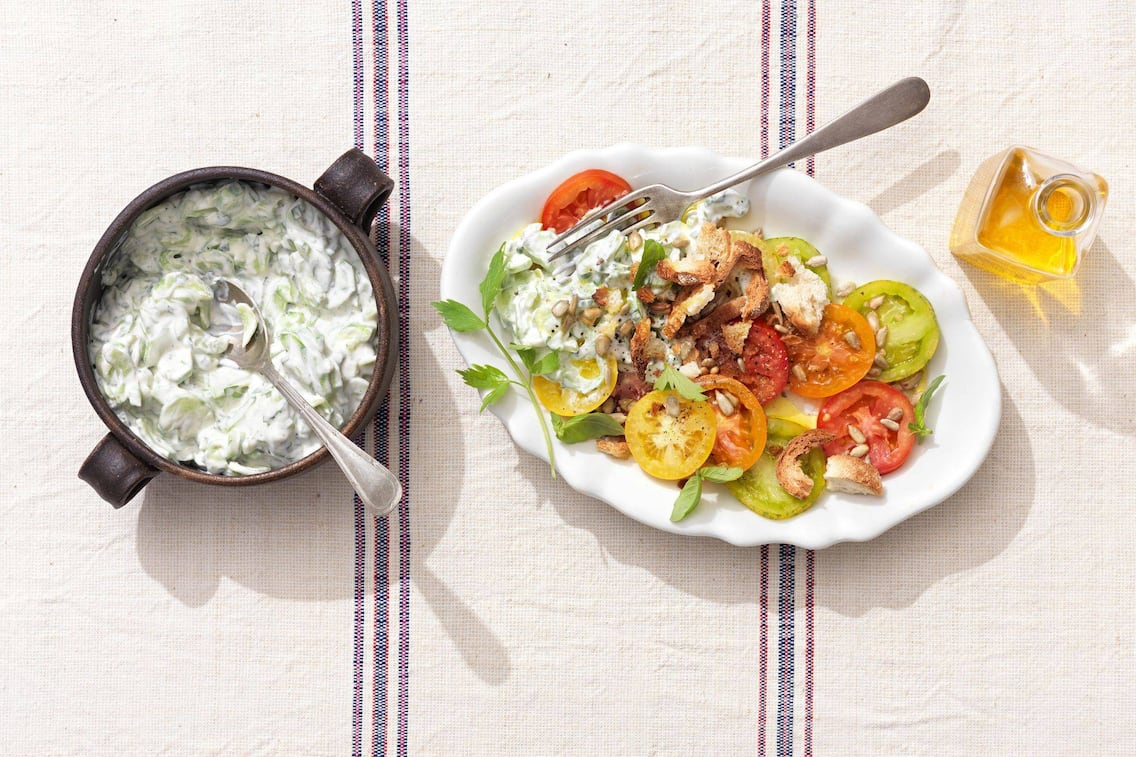 Dieser Gurkensalat ist als mediterrane Vorspeise ebenso gut zu genießen, wie als erfrischend-würzige Beilage zu feinem Grillgut. Dazu gibt es frische Tomaten mit knusprigem Brot.