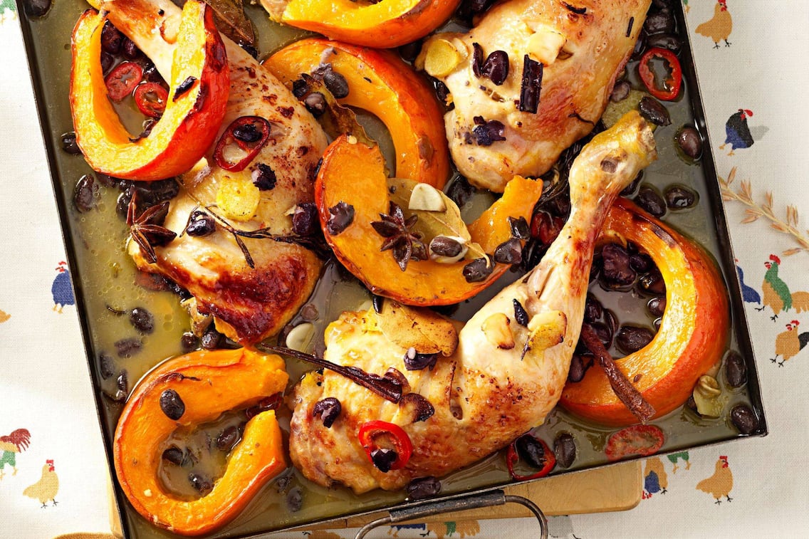 Hendlkeulen mit einem scharfen Messer mehrmals leicht einschneiden. Kürbis ohne Kerngehäuse mit der Schale in 2–3 cm breite Spalten schneiden. Knoblauch und Ingwer schälen und in dünne Scheiben schneiden. Chilischoten in Ringe schneiden.