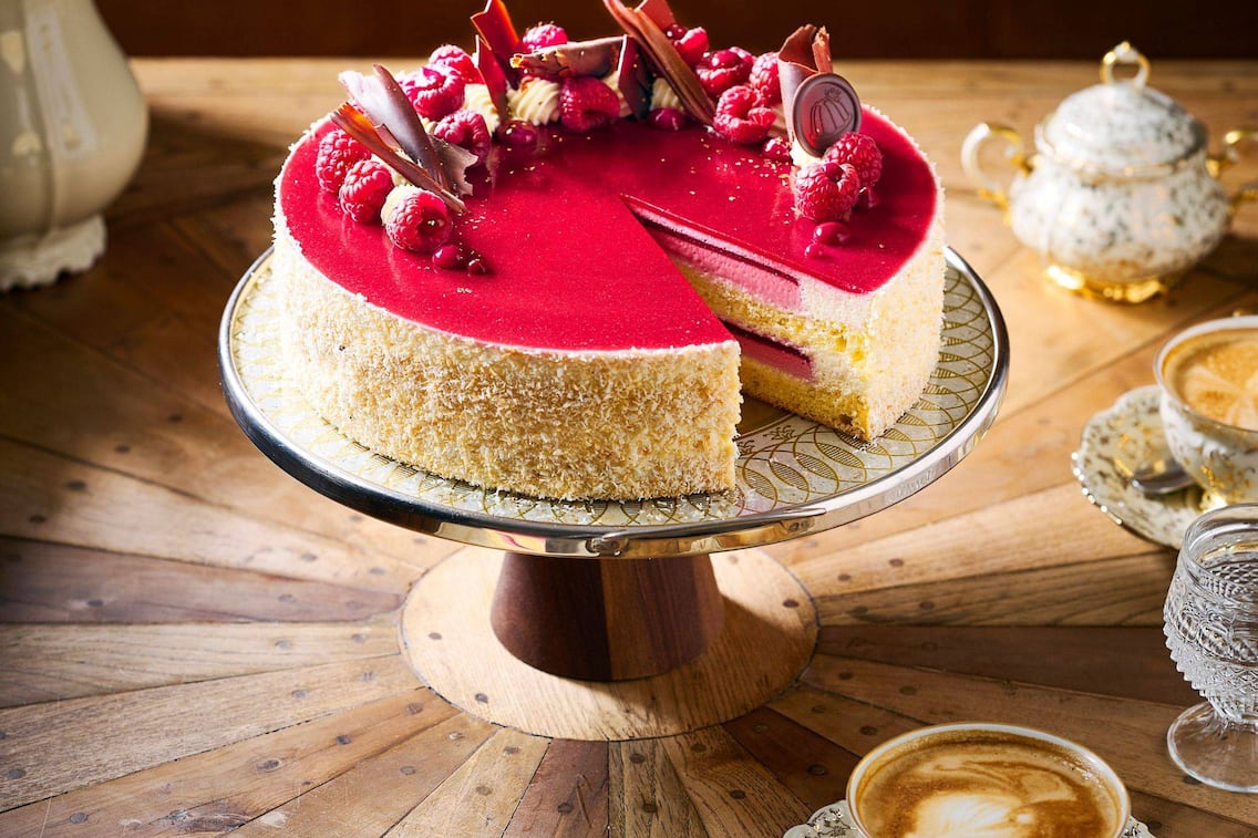 Torte mit restlicher Mascarponecreme einstreichen, vollständig bedecken und fest werden lassen. Mit leicht erwärmtem Himbeerspiegel bedecken und nach Wunsch garnieren.