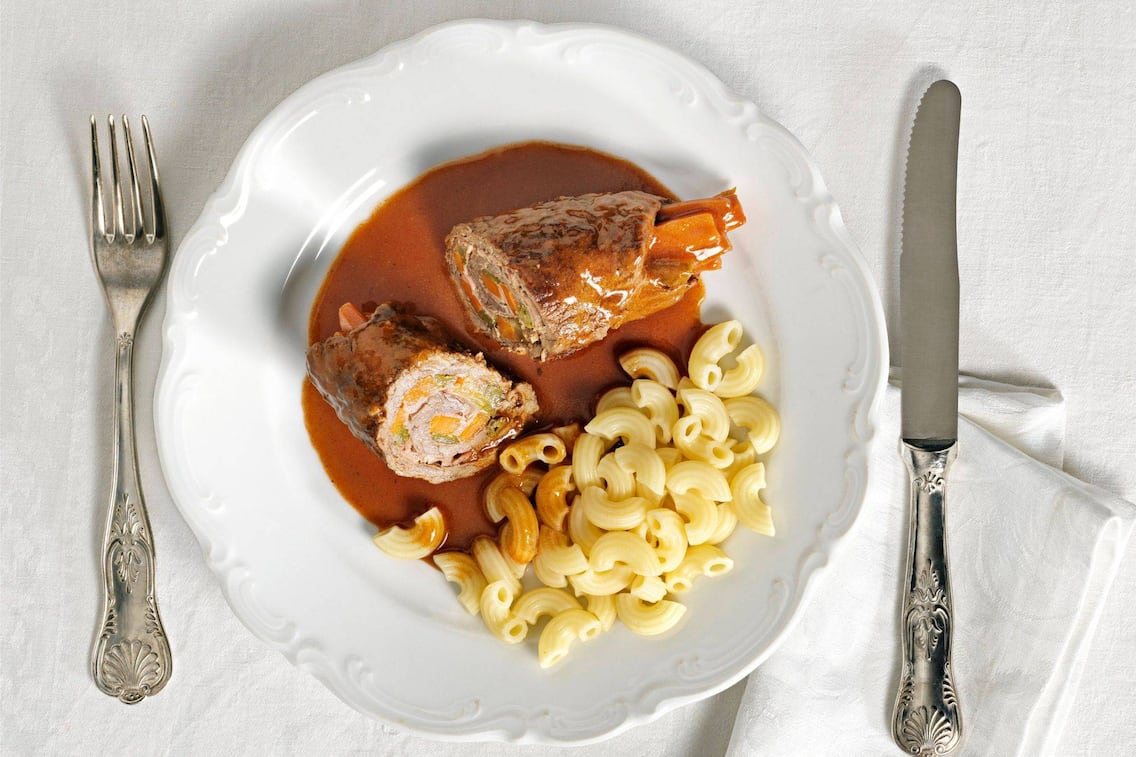 In der Zwischenzeit die Rouladen kurz anbraten und herausnehmen. Die Pfanne mit Wasser aufgießen und den entstandenen Saft auf die Gemüsesauce leeren. Rouladen einlegen und mit kochendem Wasser ganz bedecken. Zugedeckt 1 Stunde dünsten.
