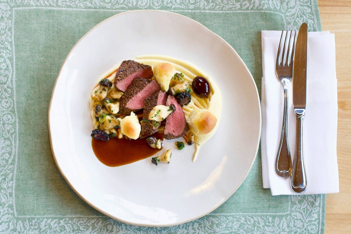Den Maibockrücken mit Salz würzen und im geschroteten Wildgewürz wenden. Scharf anbraten und bei 100°C in den Ofen geben. Sobald eine Kerntemperatur von 54°C erreicht ist, den Maibock herausnehmen für ca. 15 Minuten bei 72°C im Hold-o-mat rasten lassen.