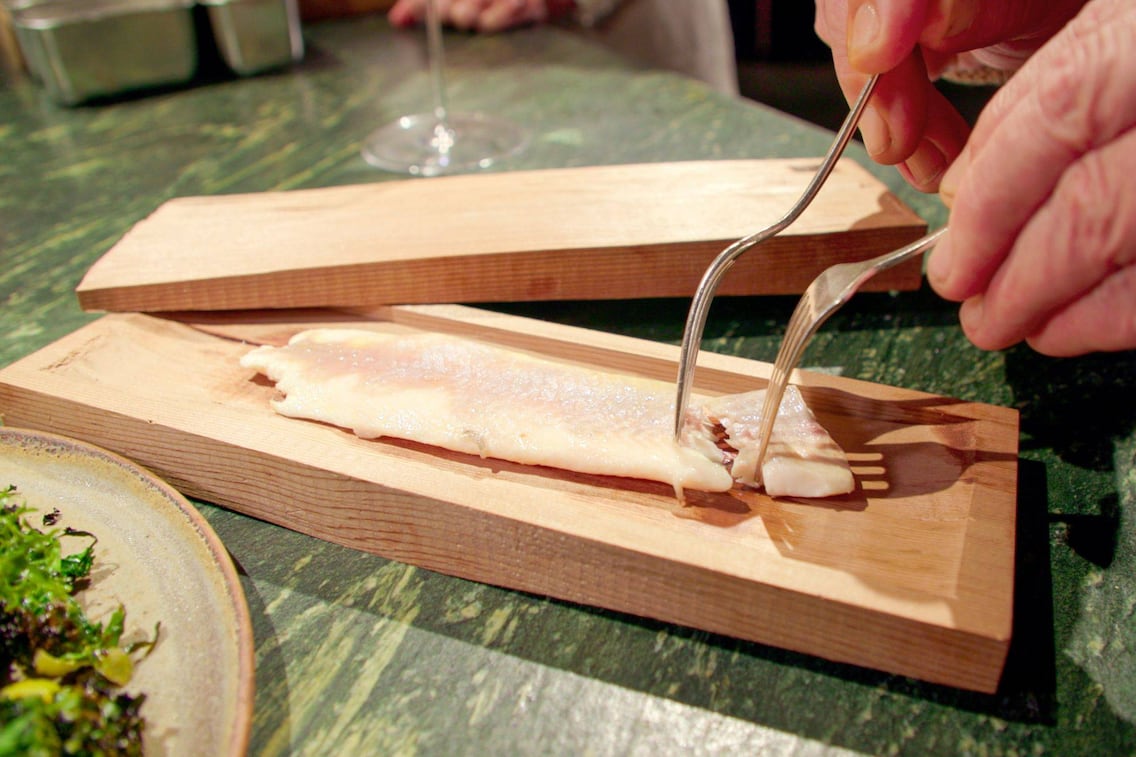 Eine Seite der Filets mit flüssiger Butter bestreichen und leicht salzen. Rasch zwischen die heißen Schindeln legen. Timer auf 8 Minuten stellen. Danach nicht sofort öffnen, sondern direkt servieren. Erst am Tisch öffnen – das Aroma entfaltet sich beim Öffnen.
