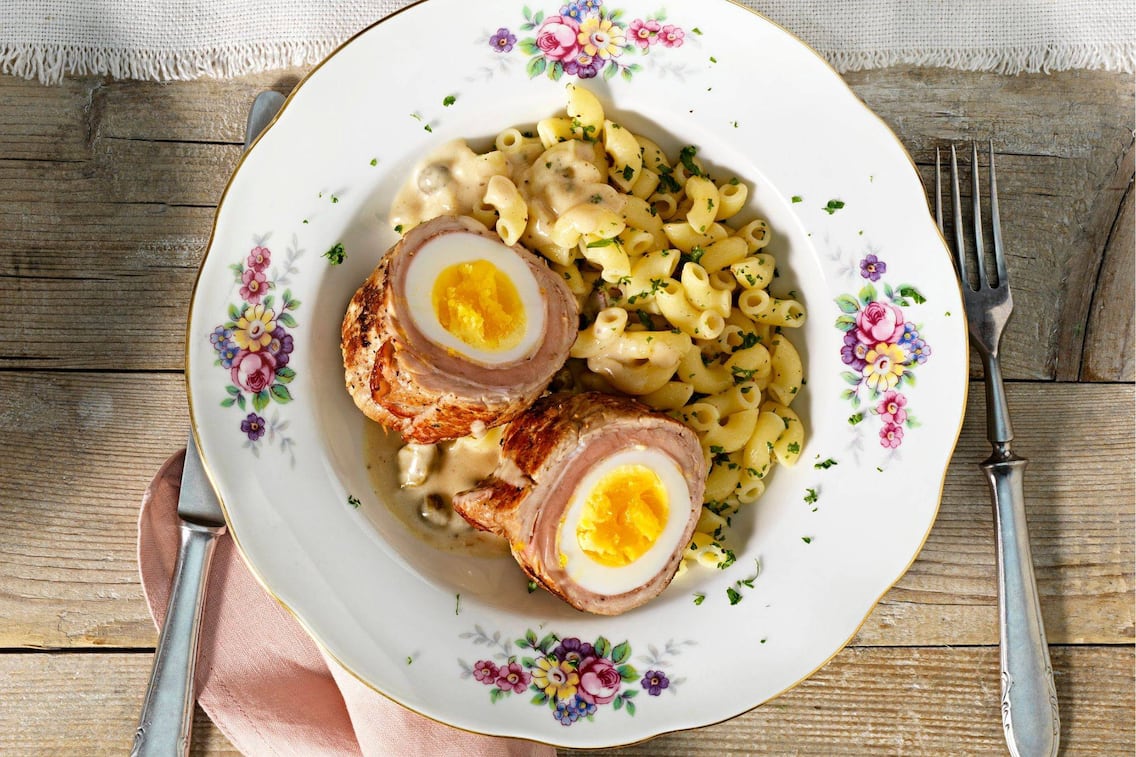Darauf jeweils ein geschältes Ei platzieren und das Fleisch darüber einschlagen. Die gefüllten Schnitzel mit Küchengarn wie einen Rollbraten binden.