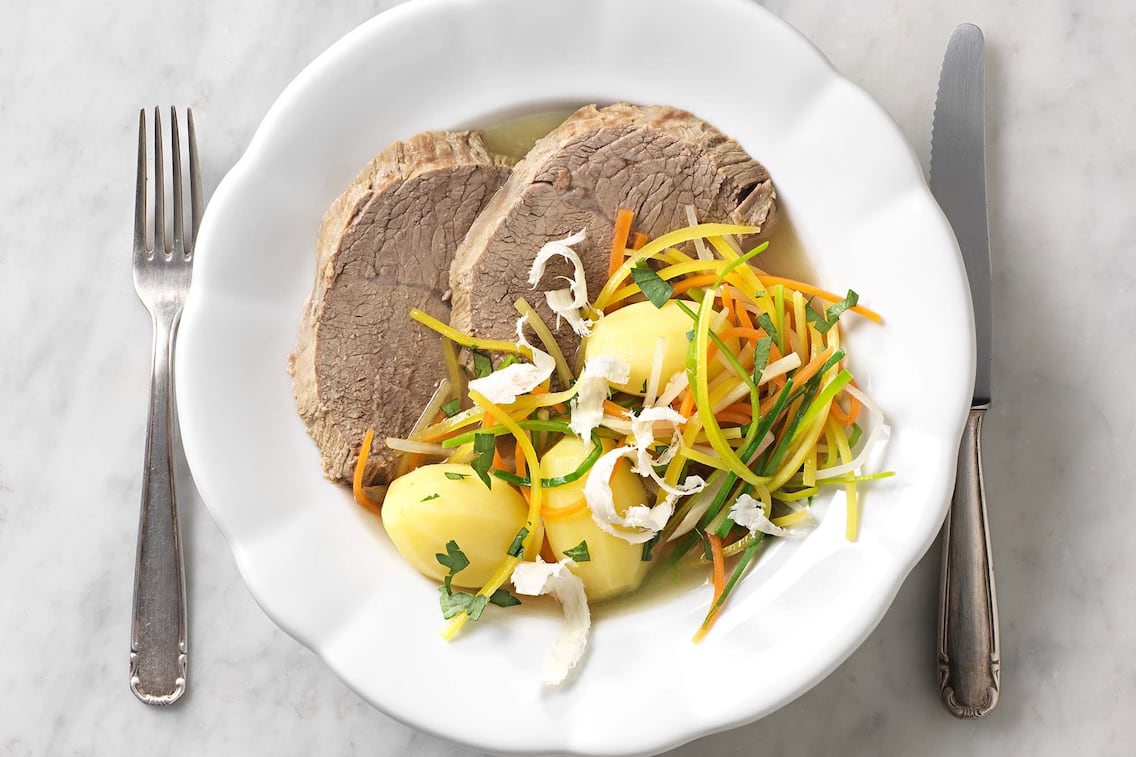 Fleisch und Gemüse anrichten und mit reichlich Suppe übergießen. Mit Petersilie und Kren bestreuen und mit Salzerdäpfeln servieren.